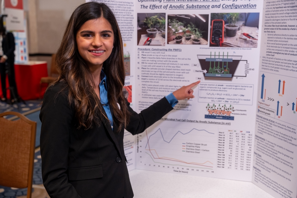 Maya Gandhi won the $10,000 DoD STEM Talent Award for her project exploring different substances to boost energy output of plant microbial fuel cells, which generate electricity using living plants and microbes.