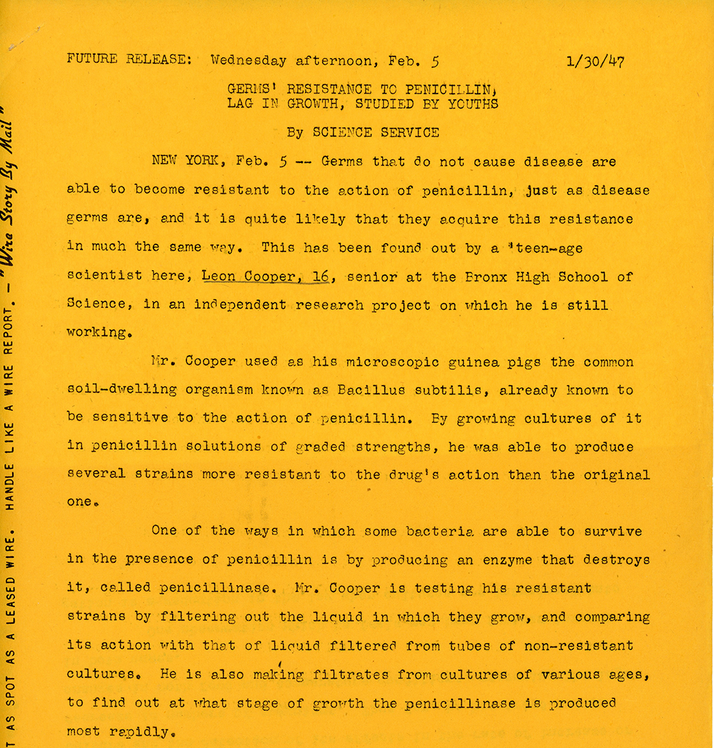 A Science Service (now called Society for Science) article about Leon Cooper’s STS project.