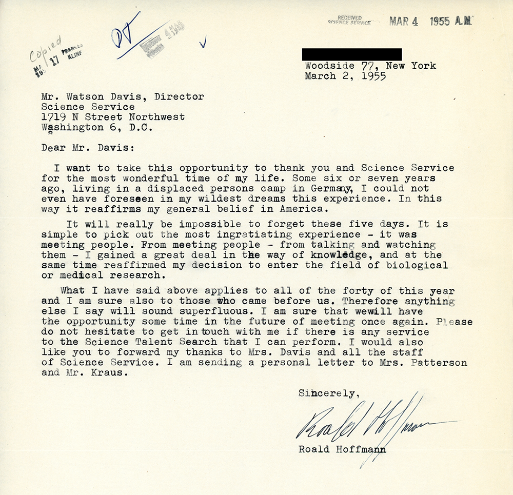 A letter from Hoffmann to Science Service (now called Society for Science) President Watson Davis, thanking him for the opportunity to participate in STS. Hoffmann and his family came to the U.S. in 1949 after fleeing Poland as refugees and surviving the Nazi occupation.