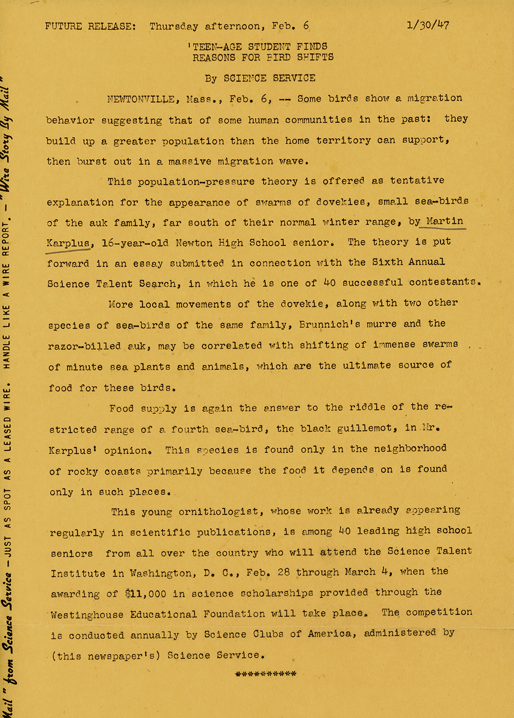 A Science Service (now called Society for Science) article about Karplus’ work on migratory birds.